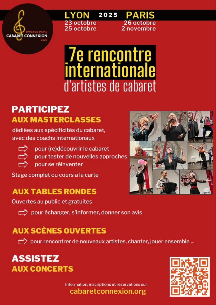 Le cabaret est né à Paris en 1881 et s’est depuis épanoui à Chicago au début du siècle. Chicago Paris Cabaret Connexion unit ces deux communautés par le biais d’échanges culturels. Avec « La Connexion », nous faisons avancer ensemble l’Art du Cabaret.
